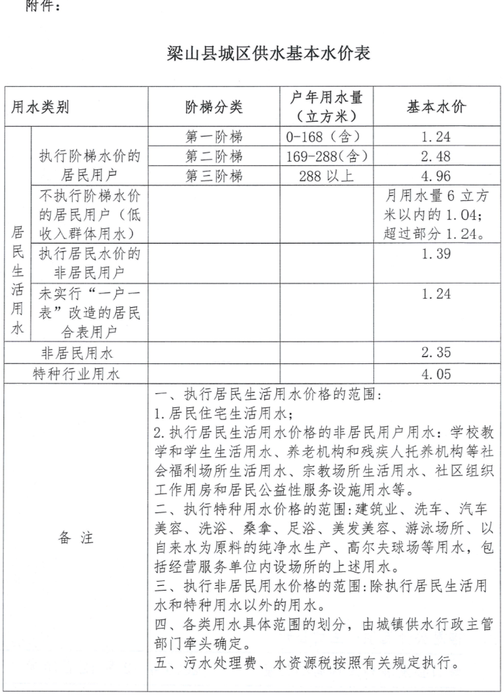 梁山县关于优化调整城区基本水价的补充通知